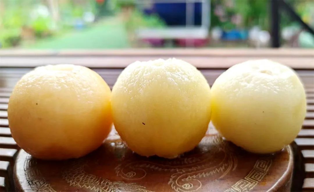 为保证枇杷的大小、口感及品质,每个枝头仅保留两到三个果实。随手摘下一颗成熟的果实,表皮金黄光滑,个头圆润饱满,重量约30克。