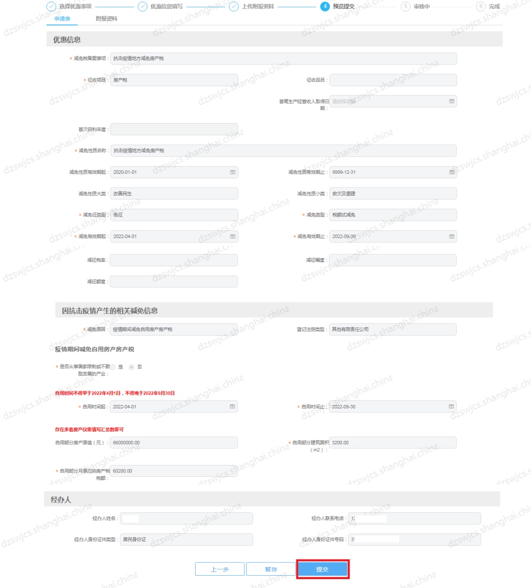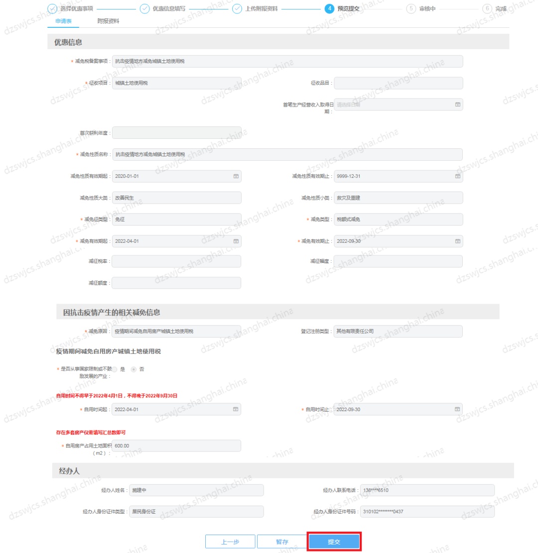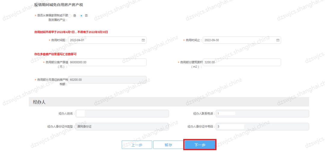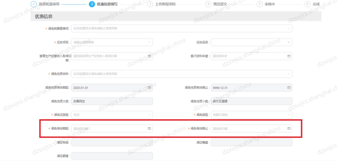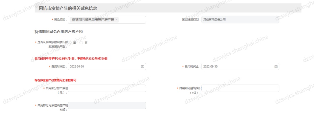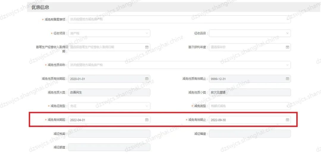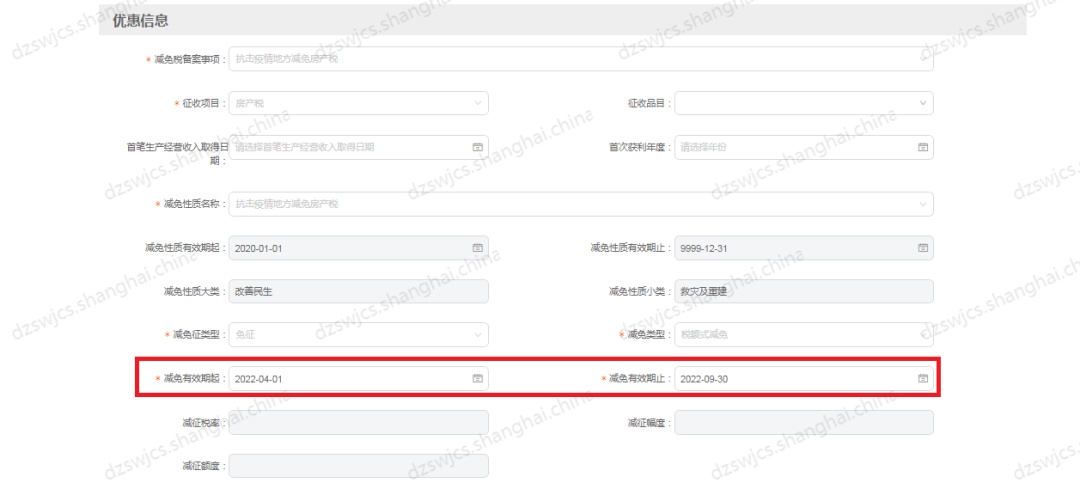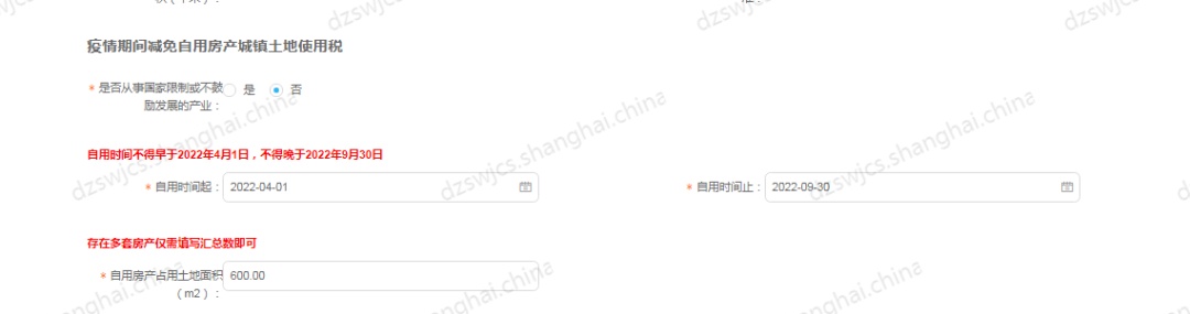 如:申请疫情期间减免自用房产城镇土地使用税减免期为2022.4-2022.9;