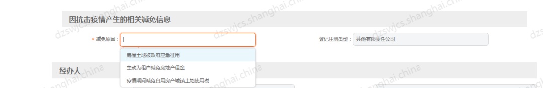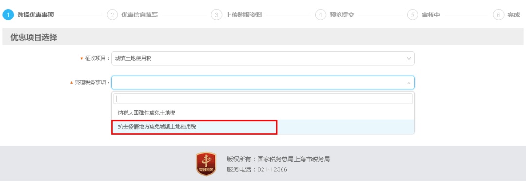 受理税务事项:分别对应“抗击疫情地方减免城镇土地使用税”或“抗击疫情地方减免房产税”