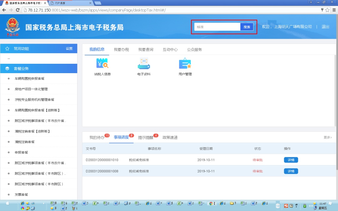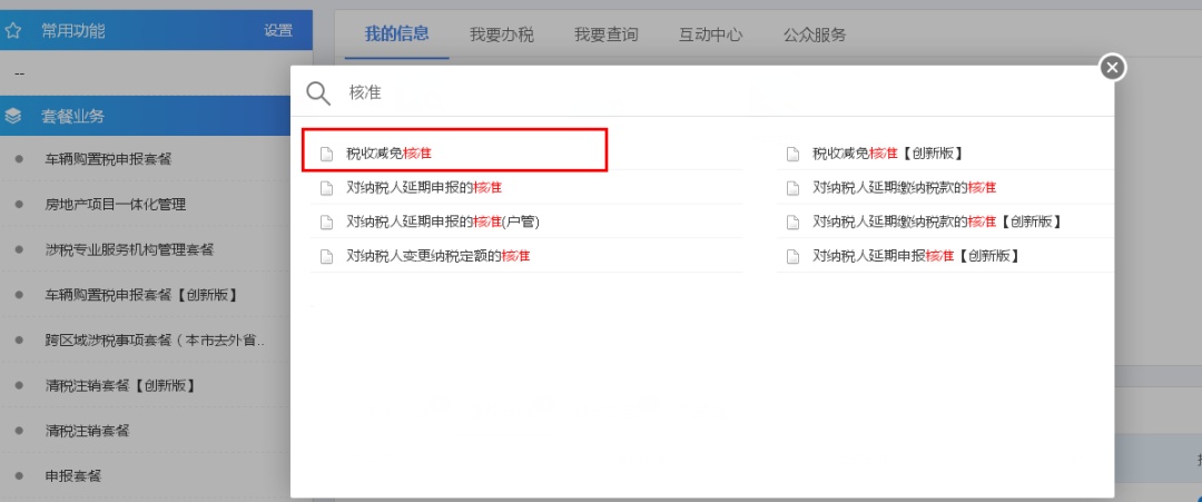 或通过主页上方搜索关键字“核准”,在搜索结果中选择“税收减免核准”