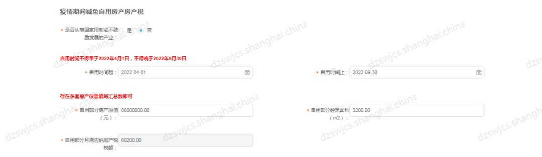 如:申请疫情期间减免自用房产房产税减免期为2022.4-2022.9;