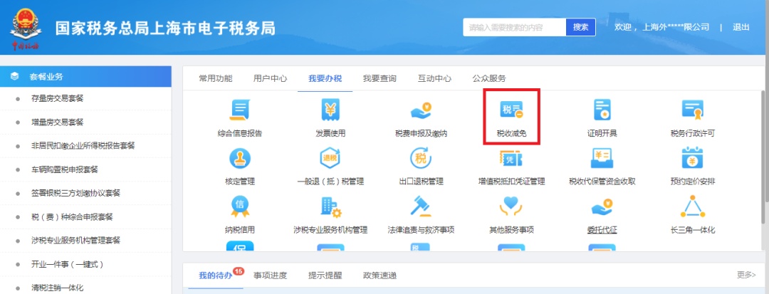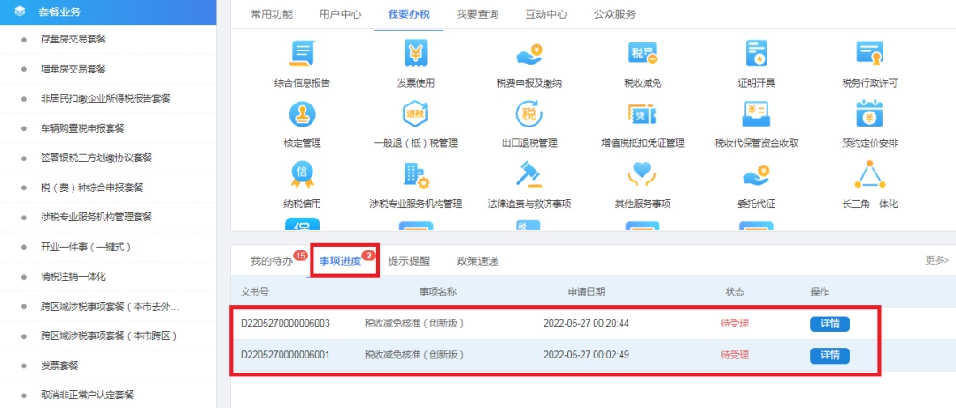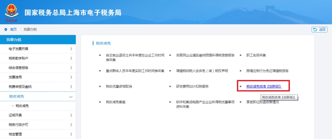 进入“税收减免核准”申请页面: