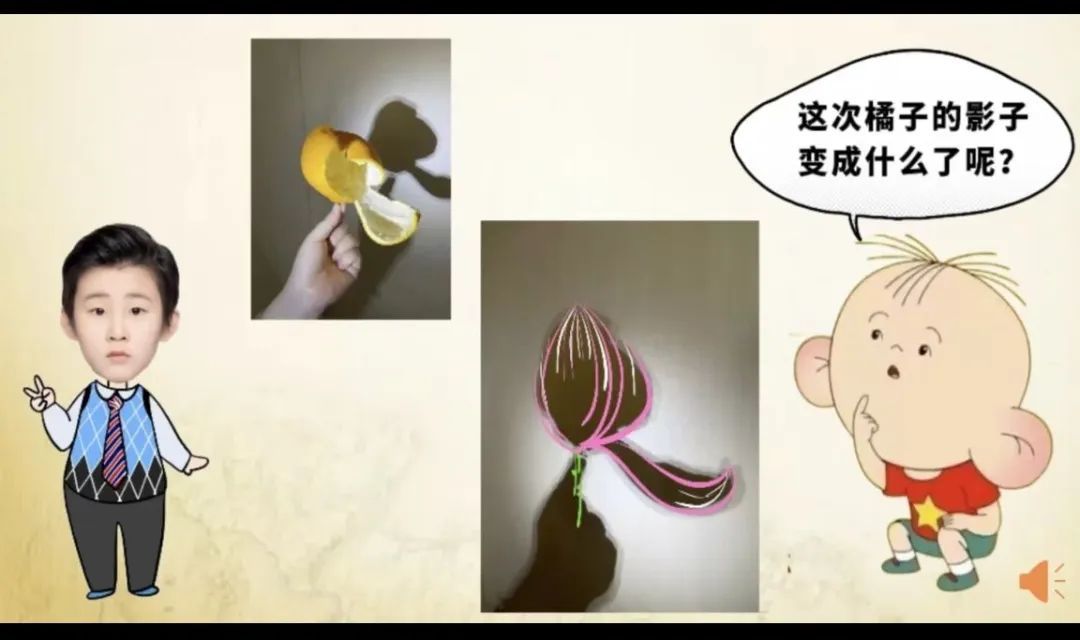 对于大班的孩子,老师们则引导对蔬果不同影子的借行想象。通过和幼儿共同玩各种影子游戏,让孩子们发现“有光线就会有影子,影子会根据光源、摆放方式的不同而发生改变”。