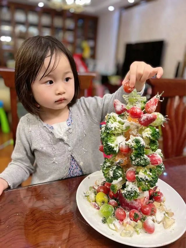 来自小班的张歆珞小朋友,在完成第一幅黄瓜裙作品后,就“一发不可收拾”,动手反复试验,完成了一颗用西蓝花、草莓、小番茄、猕猴桃等各类材料做成的圣诞树。看着孩子在创作过程中,坚持自己动手、反复试验各种食材、精心造型和配色,最终完成了一幅“艺术作品”后,张歆珞家长向记者感叹完全没想到:“果然,兴趣是最好的老师,艺术来源于生活。”