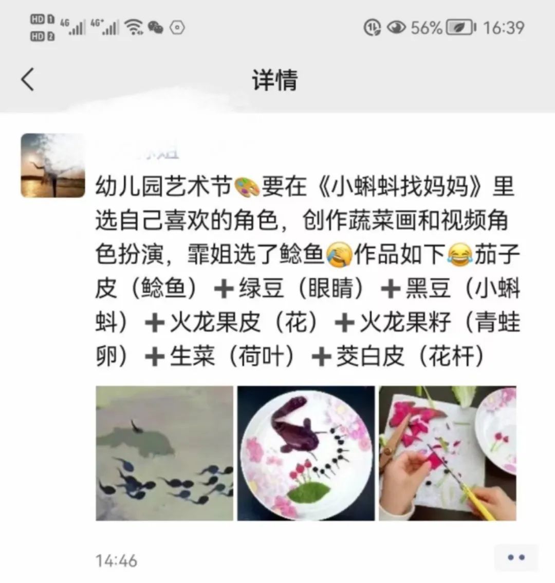 有家长反馈“幼儿的用餐习惯变好了”,有家长在看到不爱吃虾的儿子为封控期间买不到虾吃的爸爸用蔬菜做了一只虾后,感叹“原来我的孩子这么有爱”;当幼儿对自己的作品做出这样的解读“蒜苗是可以杀菌的,所以用它做‘大白’手上的箭,可以消灭病毒”时,家长连连说道“原来孩子每一个选择都是有意义和价值的”;有的家长说“用苹果皮、橘子皮都能做美术作品,废物真的变成了宝贝”,进一步发现了在生活中的美术……而这,也是华山美术幼儿园创意节的目的——“让艺术点亮每一个孩子的生命之光”。