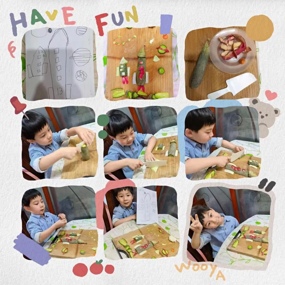 中班的叶霖颢就在老师的启发下,用西葫芦尝试了各种切的方法,切片、切丝、切块、斜切等,再试试切不同材料感受它们的软硬、厚薄等,边切边摆出神舟13号火箭的造型,还在边上添上了了北斗七星和陨石,希望自己也能有一天遨游太空。创意的过程,也圆了孩子心中最美好的梦。