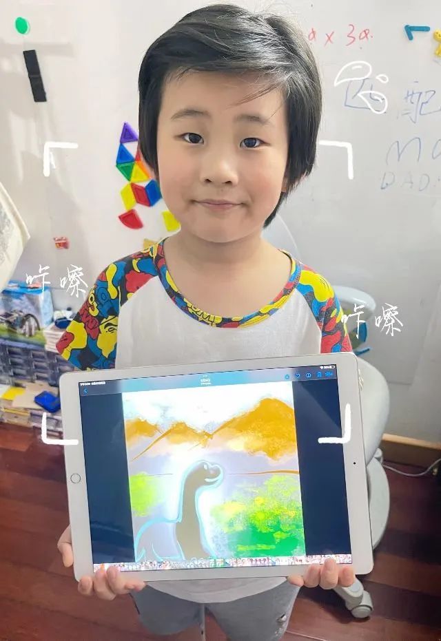 比如大班孩子关察,就在家人晚上准备食材的时候,发现辣椒的影子有点像恐龙的脖子,于是为了更加形象,他打开灯光,找到不同的光线和角度,并通过平板电脑勾画出小腕龙的身体和蓝天白云……就这样,在辣椒和光影效果下,孩子完成了一幅充满想象力的艺术作品。