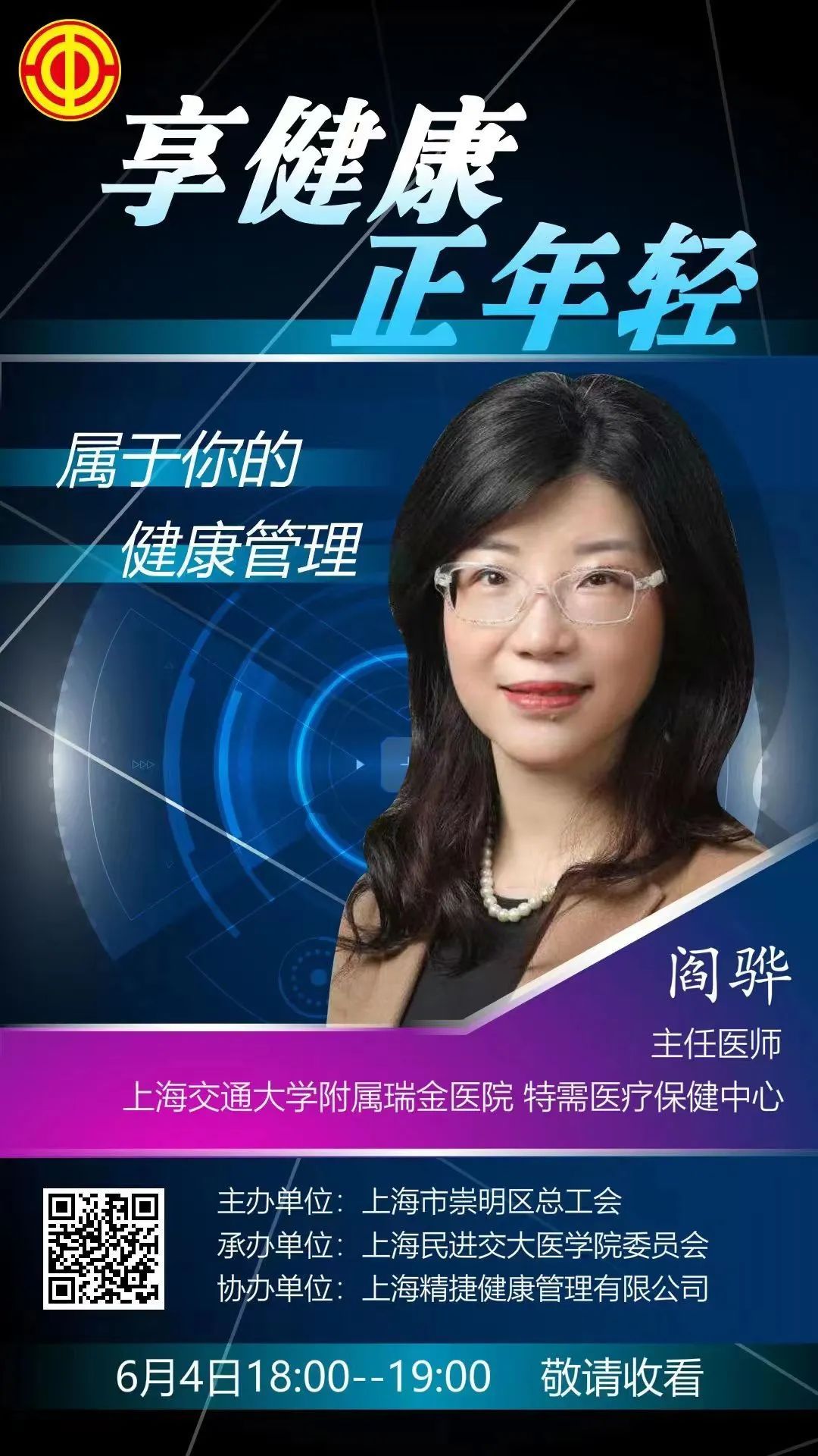 “健康体检”已经成为许多关注健康人士的必选项目,但是我们很多人对健康体检仍然存在很多疑惑。因此,本次直播特邀来自上海交通大学附属瑞金医院特需医疗保健中心主任医师阎骅老师带来《享健康,正年轻—属于你的健康管理》科普讲座,介绍如何健康管理那些都市人常见的“时尚病”。