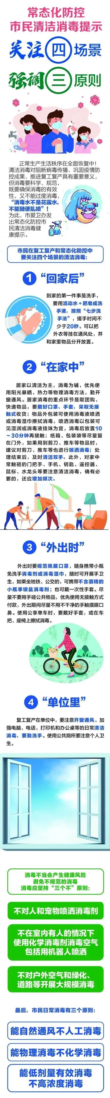 清洁消毒对阻断病毒传播、巩固疫情防控成果、推进复工复产具有重要意义。但消毒要科学、规范,既要确保消毒的有效性,又不能过度消毒,消毒水不能随便乱喷。为此,市爱卫办发出常态化防控市民清洁消毒健康提示,一图了解市民在复工复产和常态化防控中,要关注的四个场景的清洁消毒。