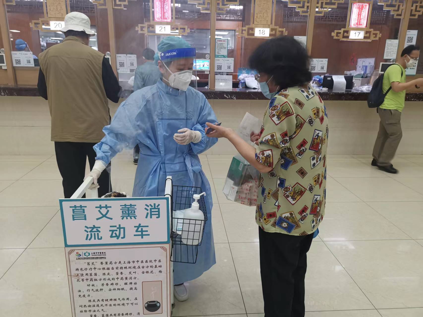 众所周知,新冠病毒的传播方式除了飞沫传播和接触传播两种外,气溶胶传播途径同样不能忽略,有效的空气消毒是控制病毒传播,防止交叉感染的重要防治手段。近期,随着疫情防控形势逐步好转,医院门诊就医者骤增,又时值仲夏五月,天气日渐潮热,大家最担心的事情莫过于就医过程中的自我防护问题。上海市中医医院运用中医独特的传统优势,将纯天然的中药制作成香薰药方,每天由专业护理人员推着自制的“菖艾”薰消流动车,定时对门诊大厅、各专科诊室、医技科室等进行香薰除疫。