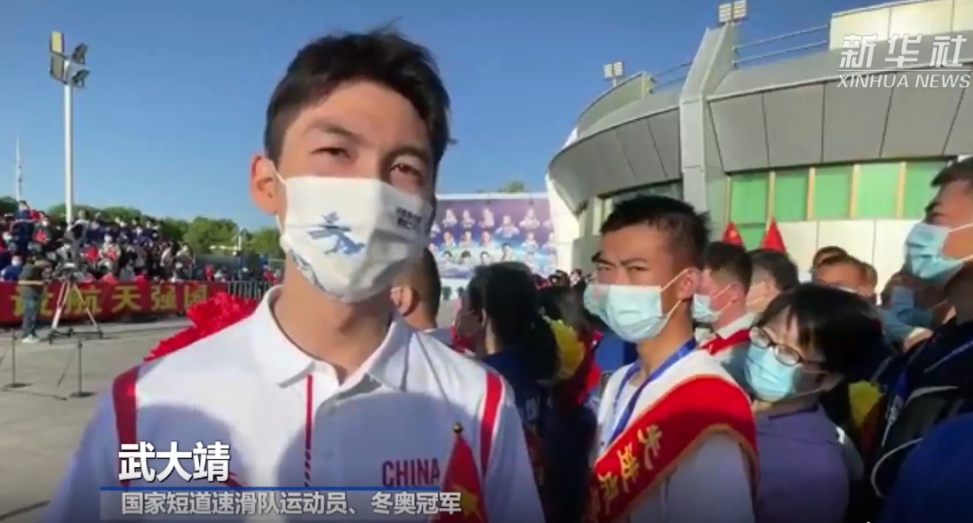 冬奥冠军武大靖也来到现场为三位航天员送行:“奥运会期间,航天英雄也在为我们运动员加油。这一次,我也代表运动员来送英雄们出征,祝福他们平安归来,一切顺利!”