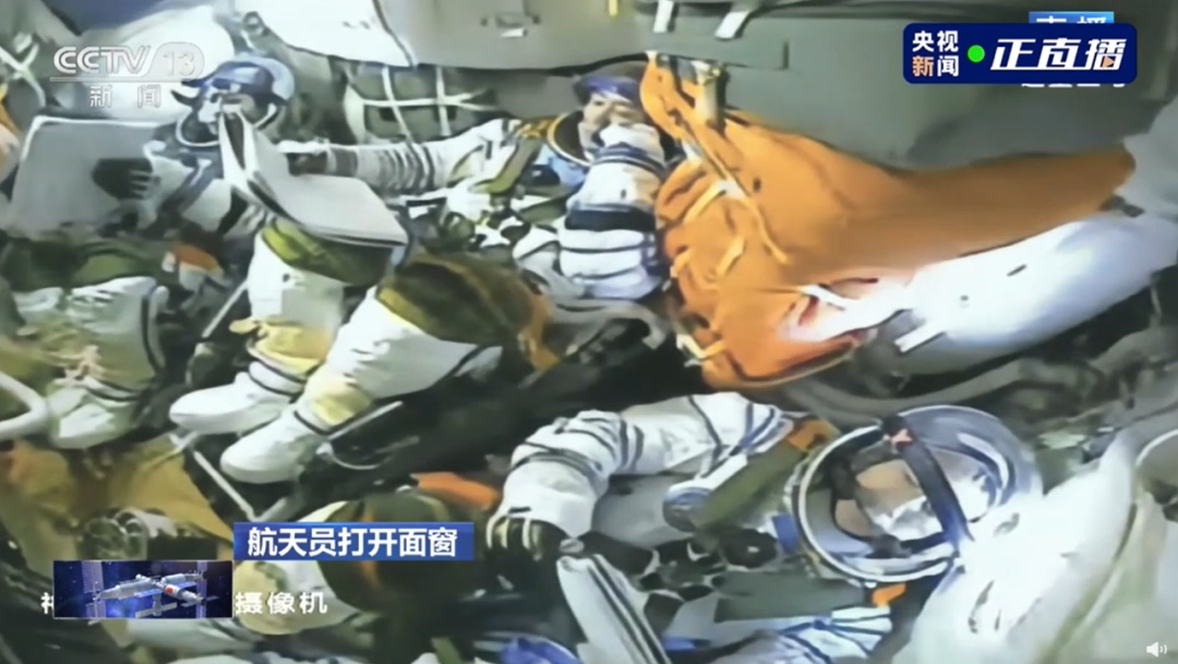 8时许,神舟十四号3名航天员开始陆续进舱。蔡旭哲率先进舱,刘洋向他竖起大拇指。刘洋第二个进舱,进舱前她对镜头挥手、敬礼、比心。指令长陈冬最后进舱,进舱前他在左臂国旗前竖起大拇指。