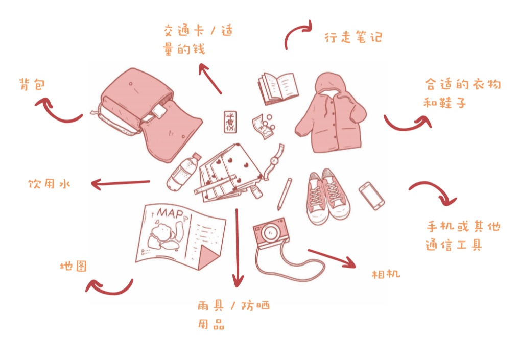 在出发前,一个优秀的城市行走小达人应该检查一下自己的行走装备。实用的物品和便于行动的服装,可以帮助你更好地应对城市行走中“脑力+体力”的挑战。