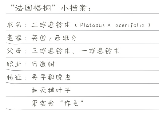 严格来说,“法国梧桐”不是梧桐树,也不产自法国,它其实是悬铃木家族的一员——这个家族里的成员都有着一串一串挂在枝头的果实,看起来就像悬挂的铃铛一样,所以才被叫作“悬铃木”。