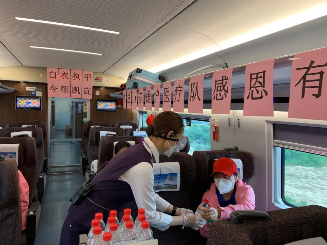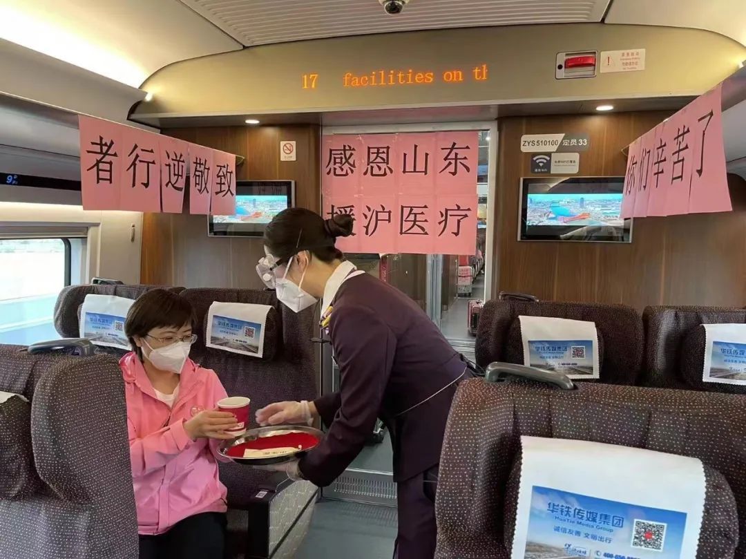 5月22日,高铁一车队接到一趟特殊的任务,运送山东援沪医疗队约1045人返程,这也是首批乘坐高铁专列返程的医疗队。“致敬逆行者!”“你们辛苦了!”“感恩山东援沪医疗队!”“白衣执甲 今朝凯旋 感恩有你!”车厢内贴满了饱含深情的标语,乘务组为每一位凯旋战士送上矿泉水和消毒用品,用自己的温馨服务感恩着所有“白衣战士”们的辛勤努力与无私付出。