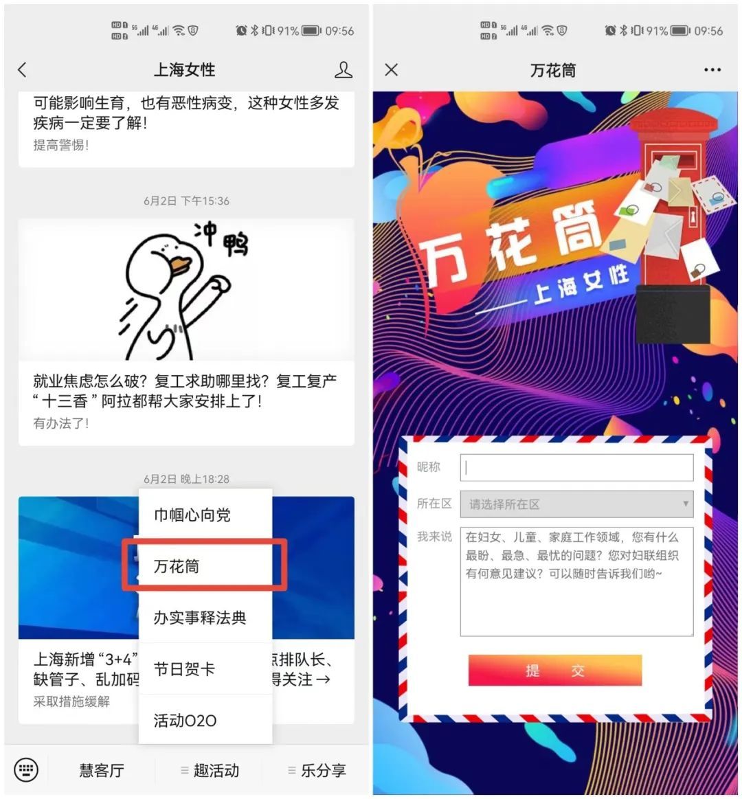 为了更好地助力每一位复工复产的女性,服务好妇女儿童家庭,市妇联依托“上海女性”微信公众号开辟了“万花筒”平台,如果你有什么诉求可以在线提交,我们会有巾帼志愿者及时对接,收集并回复大家“急难愁盼”的诉求。