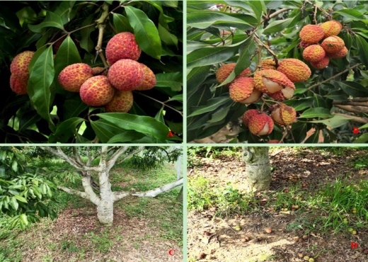 无核荔枝防裂防落技术示范。A:示范区果实饱满、颜色鲜艳,极少裂果;B:对照区严重裂果;C:示范区极少落果;D:对照区严重落果。