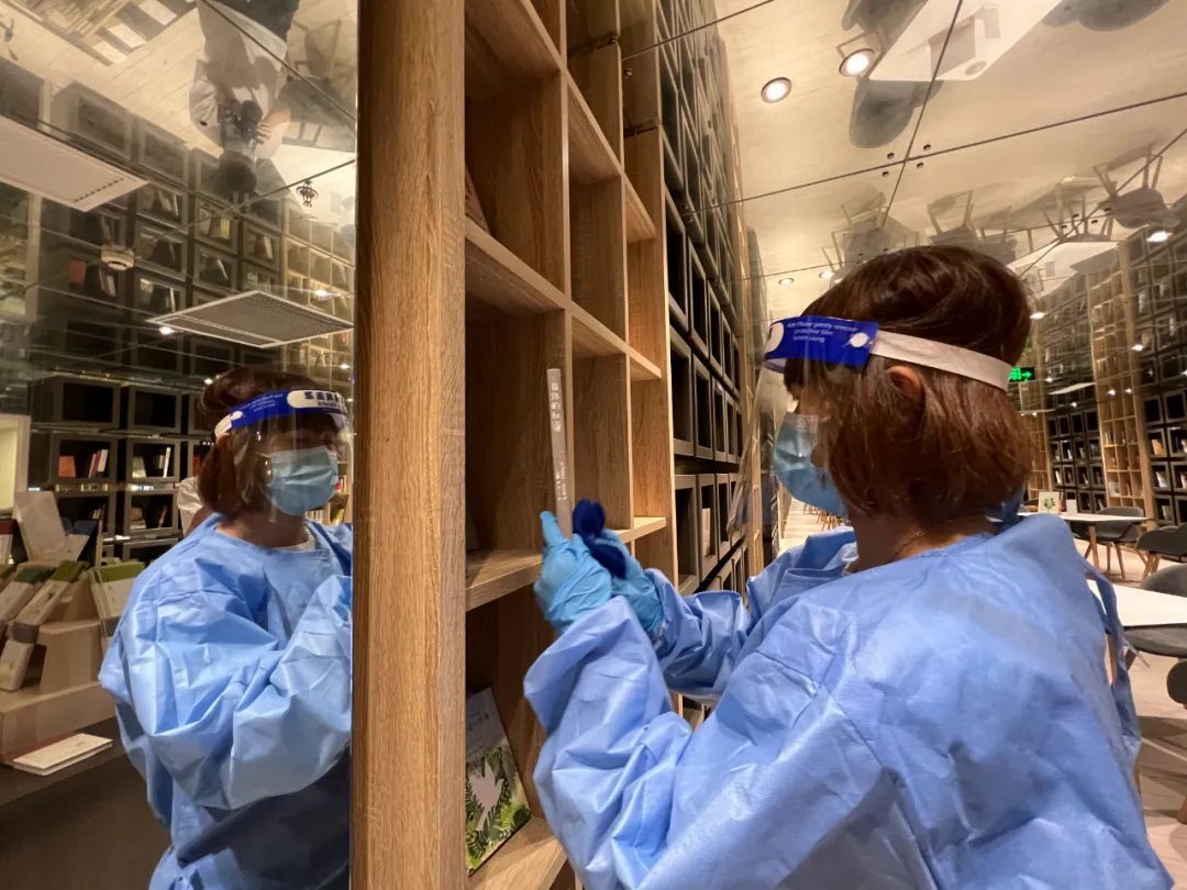 经历2个多月闭店后,位于现厂的钟书阁嘉定店正在为迎接读者做最后的准备。书店工作人员在复工后,不仅对门店图书、文创进行陈列调整,还进行了全方位的消杀、清洁和整理。