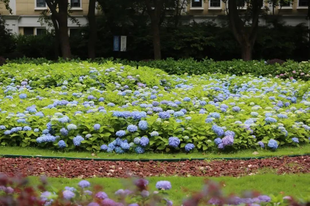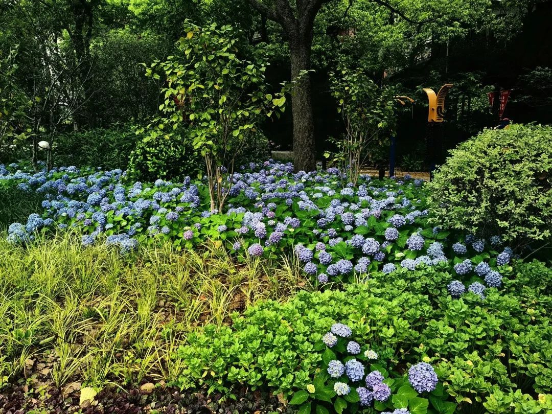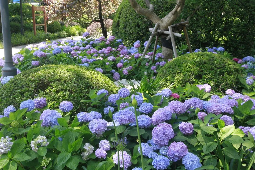 绣球纯粹的蓝紫色在观赏花卉中珍贵难得,品种繁复,花形精妙。在上海的气候条件下,绣球是沪上夏季花开最热闹的园林植物,可谓是初夏公园的“颜值担当”,在城市景观“彩化”中不可或缺。