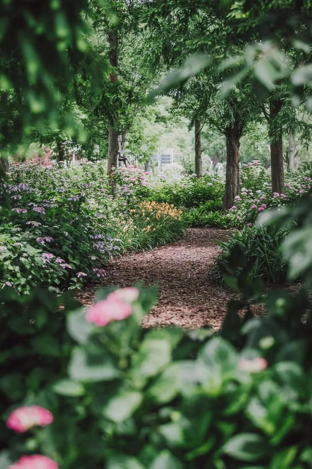 上海共青森林公园八仙花主题园为沪上首个八仙花专类主题花园,占地7000余平米,分为品种区、观景区、禅意区及休闲区四个功能区,以八仙花作为主题花卉,总共种植70余种15000余株颜色各异的八仙花。