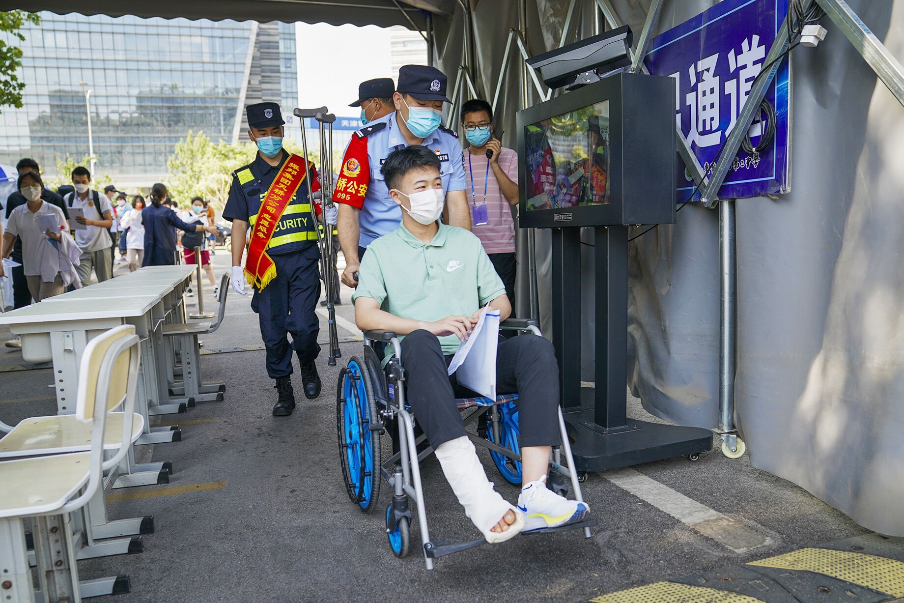 6月7日,2022年山东省夏季高考开考。莘莘学子迎来人生大考。济南市公安局在全市36个高考考点设置“护考小分队”,组织经文保、治安、交警、特巡警、人口管理等相关警种和分、县局警力提前到岗到位。开考首日,共出动警力2400余人,警车770余台,在考点周边开辟高考临时停车位近万个,为考生提供通行转送服务27人次,现场办理打印临时身份证明41份。图为6月7日济南二中高考点,济南市公安局天桥区分局黄台派出所执勤民警,护送行动不方便的考生进入考场。