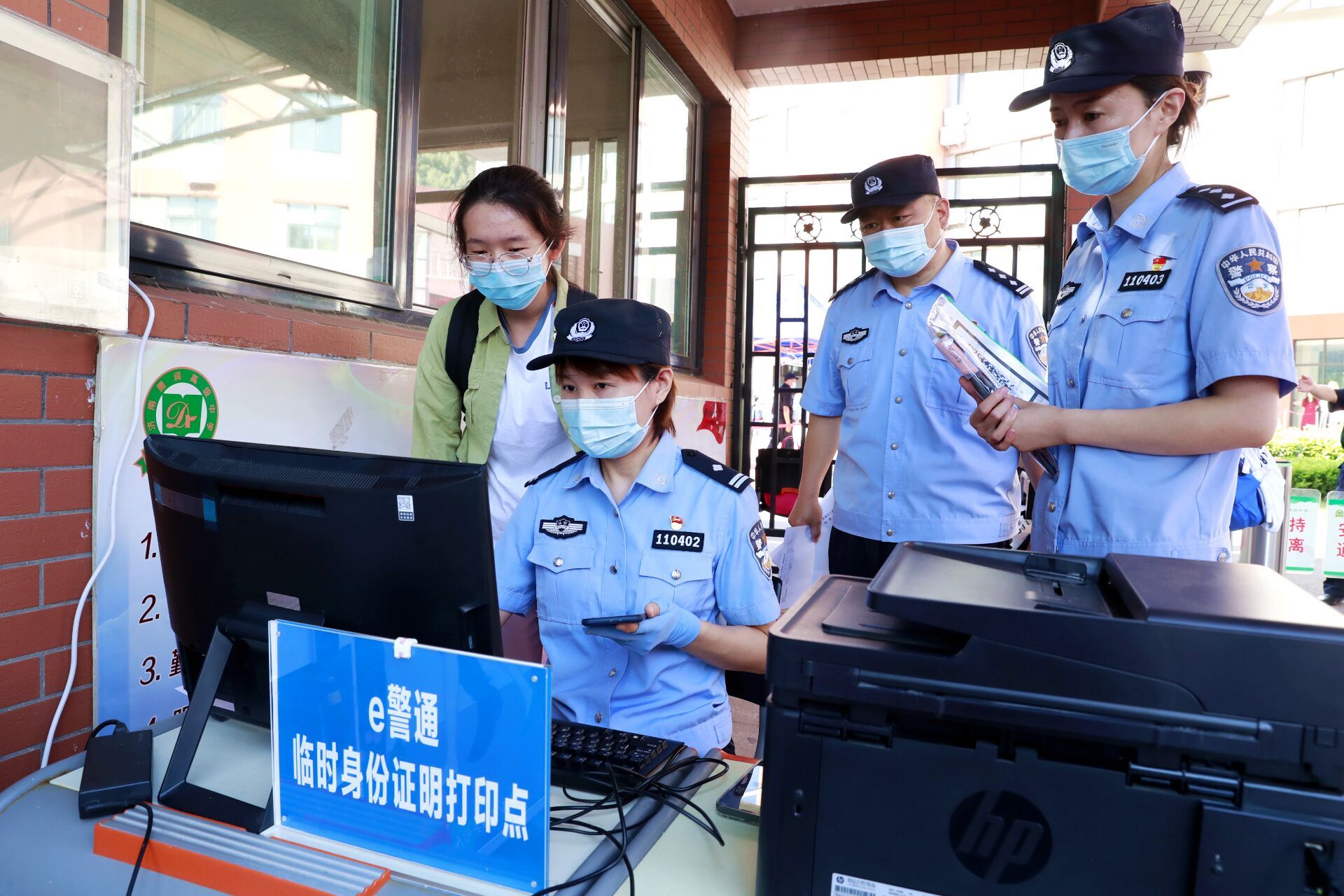 德润高级中学考点,济南市公安局历下分局姚家派出所民警使用“e警通”现场为考生开具临时身份证明。