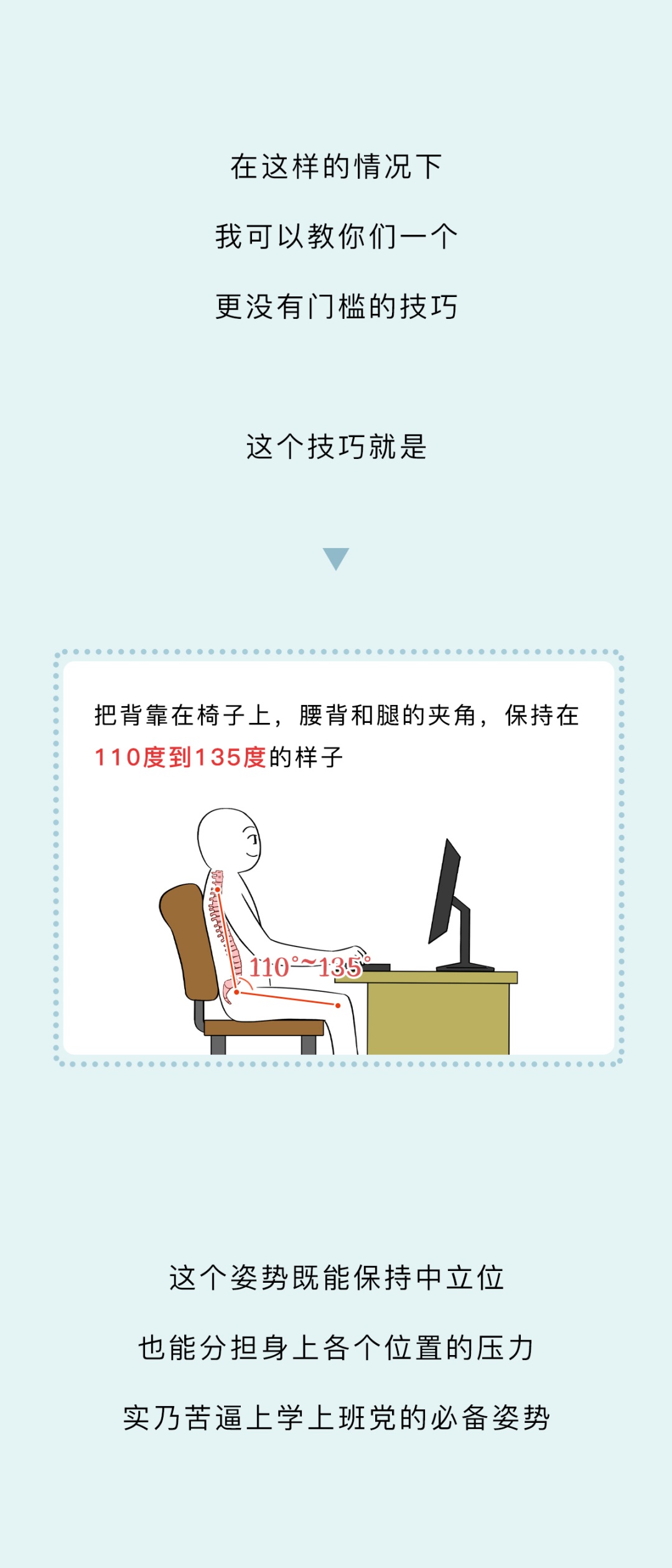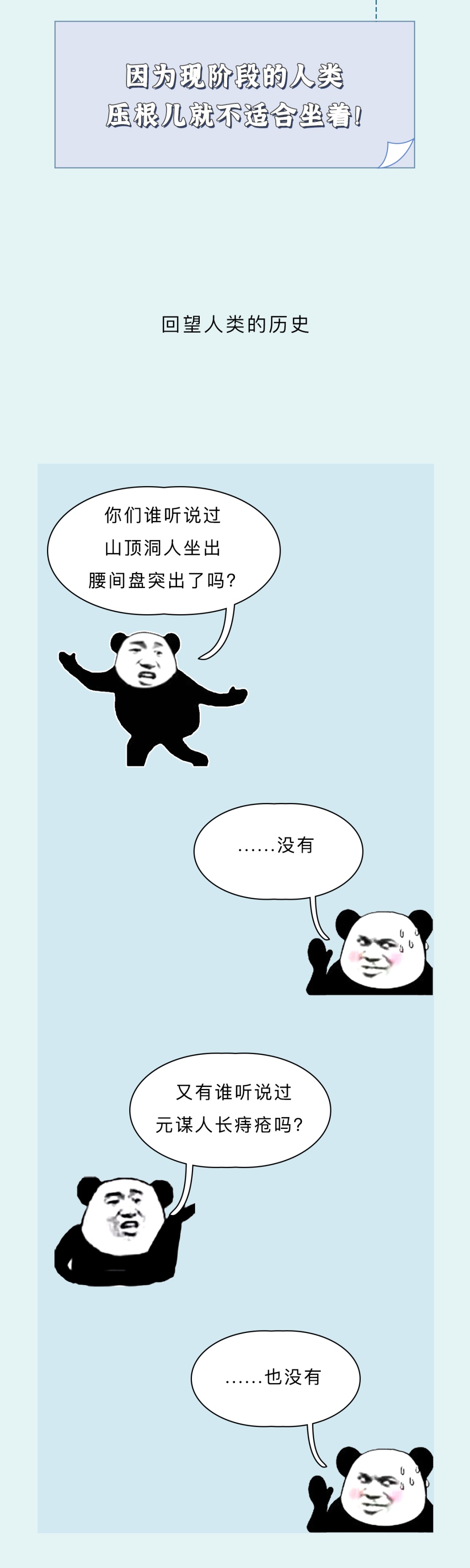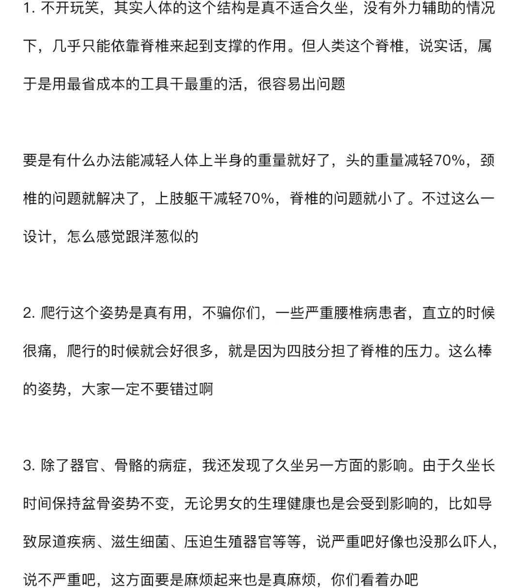 附录1.不开玩笑,其实人体的这个结构是真不适合久坐,没有外力辅助的情况下,几乎只能依靠脊椎来起到支撑的作用。但人类这个脊椎,说实话,属于是用最省成本的工具干最重的活,很容易出问题。要是有什么办法能减轻人体上半身的重量就好了,头的重量减轻70%,颈椎的问题就解决了,上肢躯干减轻70%,脊椎的问题就小了。不过这么一设计,怎么感觉跟洋葱似的2.爬行这个姿势是真有用,不骗你们,一些严重腰椎病患者,直立的时候很痛,爬行的时候就会好很多,就是因为四肢分担了脊椎的压力。这么棒的姿势,大家一定不要错过啊3.除了器官、骨骼的病症,我还发现了久坐另一方面的影响。由于久坐长时间保持盆骨姿势不变,无论男女的生理健康也是会受到影响的,比如导致尿道疾病、滋生细菌、压迫生殖器官等等,说严重吧好像也没那么吓人,说不严重吧,这方面要是麻烦起来也是真麻烦,你们看着办吧参考资料[1] 熊凯文,王瑶,程珊,张太辉,丛林,胡文东.基于表面肌电的不同脊柱前后倾角坐姿腰部肌肉收缩情况研究[J].现代生物医学进展,2021,21(24):4694-4698.DOI:10.13241/j.cnki.pmb.2021.24.019.[2] 周艮艮. 不同坐姿下肩关节等速肌力表现及表面肌电特征[D].苏州大学,2020.DOI:10.27351/d.cnki.gszhu.2020.000697.[3] Jenny Pynt, Joy Higgs & Martin Mackey (2001) Seeking the optimal posture of the seated lumbar spine, Physiotherapy Theory and Practice, 17:1, 5-21, DOI:10.1080/09593980151143228