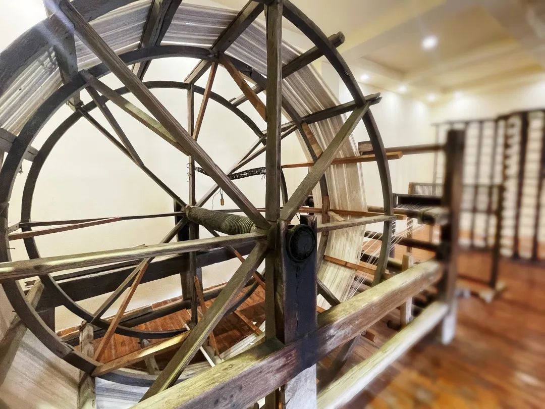 ▲大圆框式整经车(又称鼓式经纱车),由木制腰鼓式经轴、竖式经架及大小印筘租车,是华东地区仅存的两台最大的半自动整经车之一。该整经法由古代轴架式整经法的工艺原理逐步发展起来。