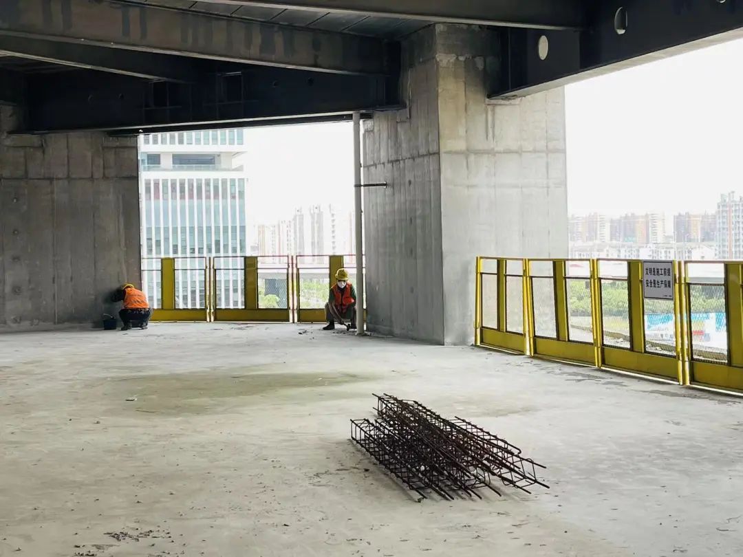 在“科学之门”双子塔的东塔五楼施工现场,该楼层主体结构已施工完毕,返岗的工人们正在做层面清理,准备接受结构验收以及下一轮建设工作面移交,进入安装施工工序。