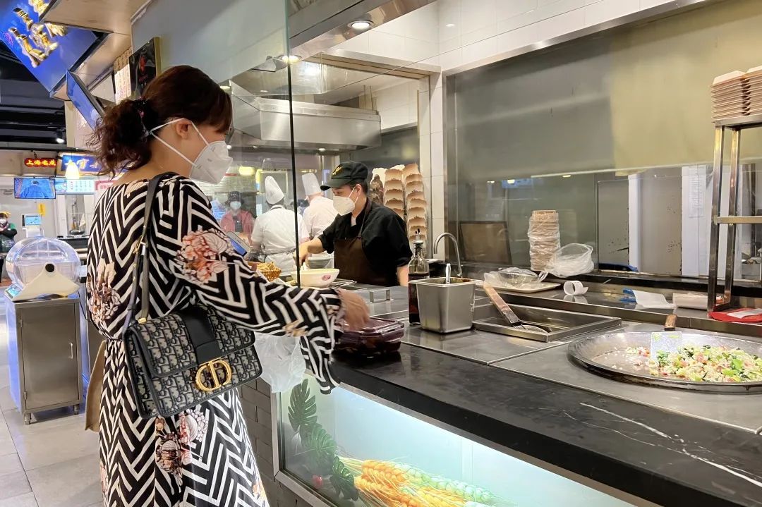 三楼是一片美食广场,十余家餐饮门店中,大部分已经开张,但根据防疫要求和商场规定,目前只提供自提和外卖服务。记者看到,大壶春、鲜得来、鸭血粉丝汤等老字号门店前,香气四溢,顾客保持安全间隔排起了队。