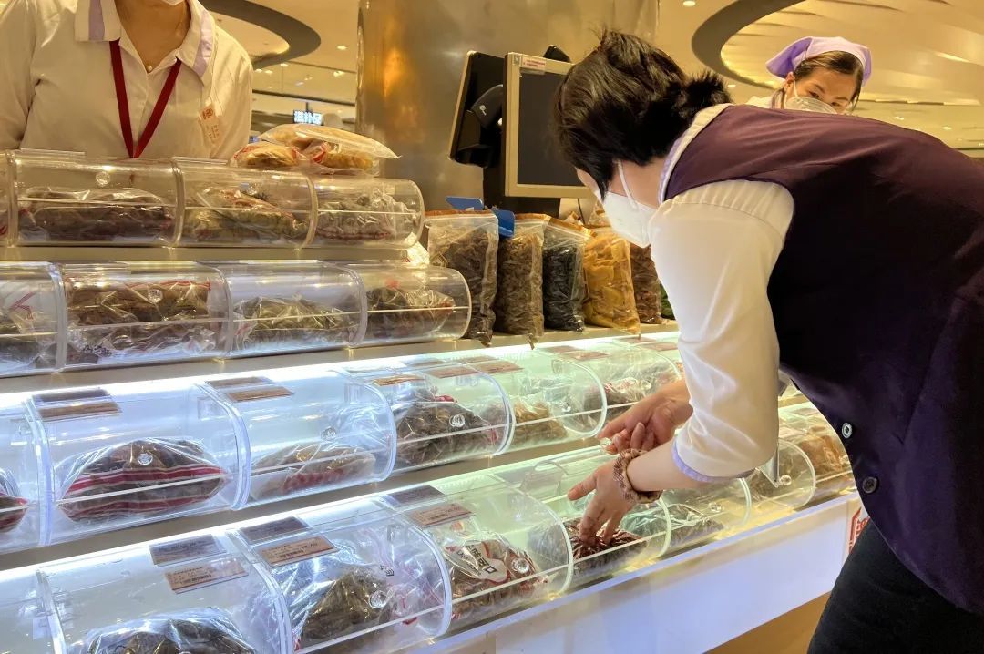 记者注意到,往常散装在玻璃柜后,通过称斤售卖的糕饼糖果、果脯蜜饯,如今都“变了样”。工作人员提前将它们分装进一个个小袋,扎口塑封好,有市民前来购买时,不再二次拆包,直接整包称重出售。