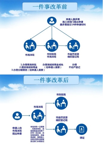 改革前,申请人按流程应当先向市海洋局提出“海域使用权审核”申请,获批后再前往市不动产登记中心办理“不动产登记”;如涉及海域使用金减免,还需经市财政局批准,一般需要跑两到三个部门。改革后,市海洋局整合3个环节,5个行政服务事项,打通多部门“一件事”审批通道,实现了我局“一口受理”,申请人只需向市海洋局提交一次申请,无需辗转多个部门。