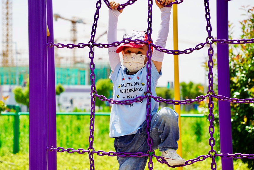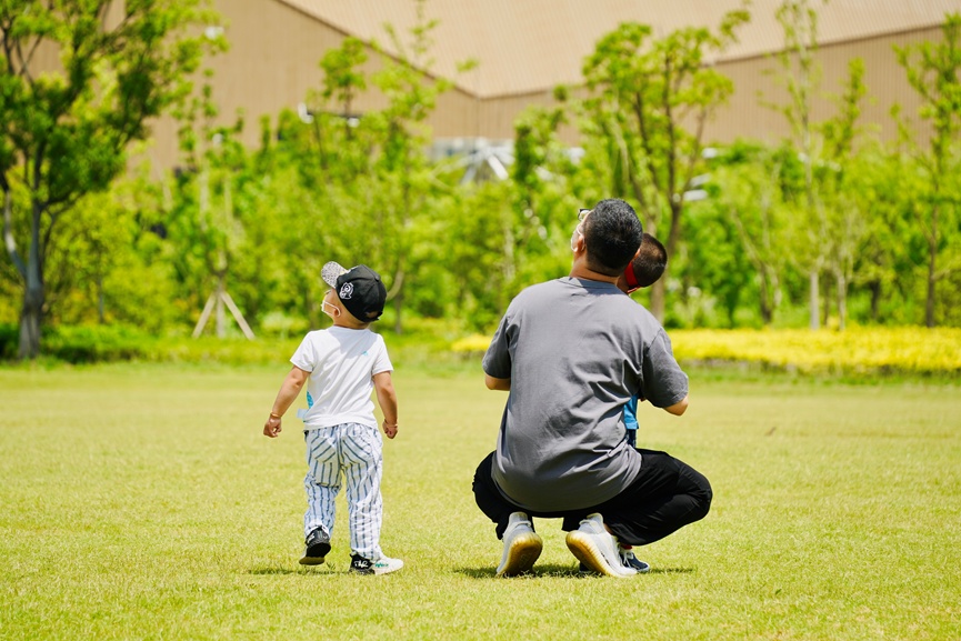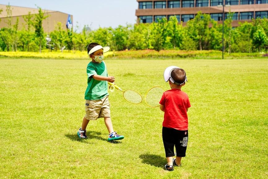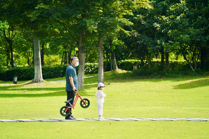 走进赵巷体育公园,穿过小径,映入眼帘的是绿茵茵的草坪,三两孩童骑着单车,围着草坪尽情玩耍嬉戏。不少家长和孩子在公园里互动,享受着难得的亲子时光。在西南角的健身器材旁,老年朋友也纷纷前来锻炼,重拾被疫情耽搁的健身日程。