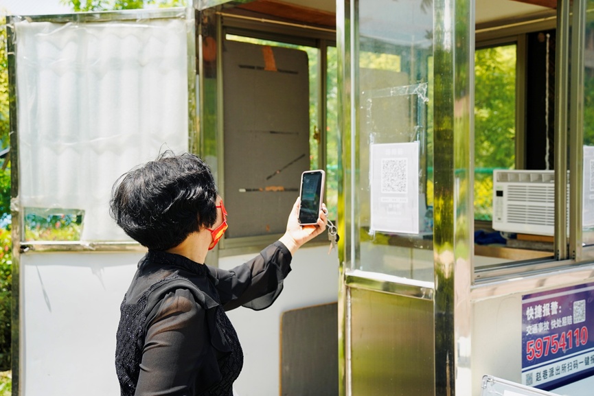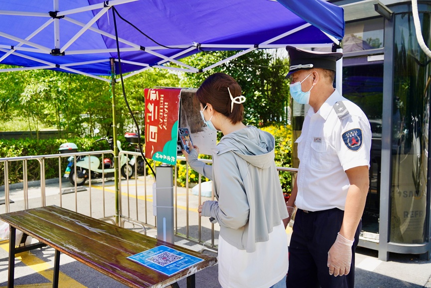据了解,赵巷公园作为周边居民的后花园,有许多家长带着孩子前来休闲娱乐。在公园停车场入口,市民须扫描“场所码”或刷“数字哨兵”,验证72小时内核酸阴性证明,方可入园。