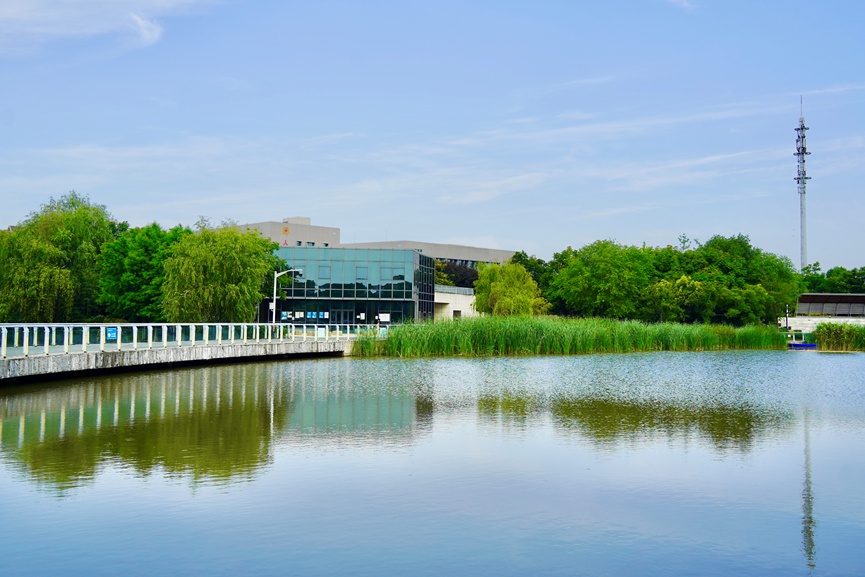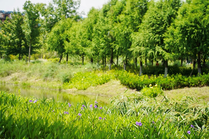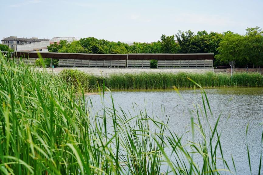 从赵巷公园停车场扫码入内,拾级而上,满目青翠,顿时豁然开朗。中心湖泊边一圈翠绿的芦苇随风飘摇,河岸边高耸的水杉和柳树相得益彰。阳光洒下,河水波光粼粼,偶有三两只野鸭在水里嬉戏玩闹,一切显得生机盎然。