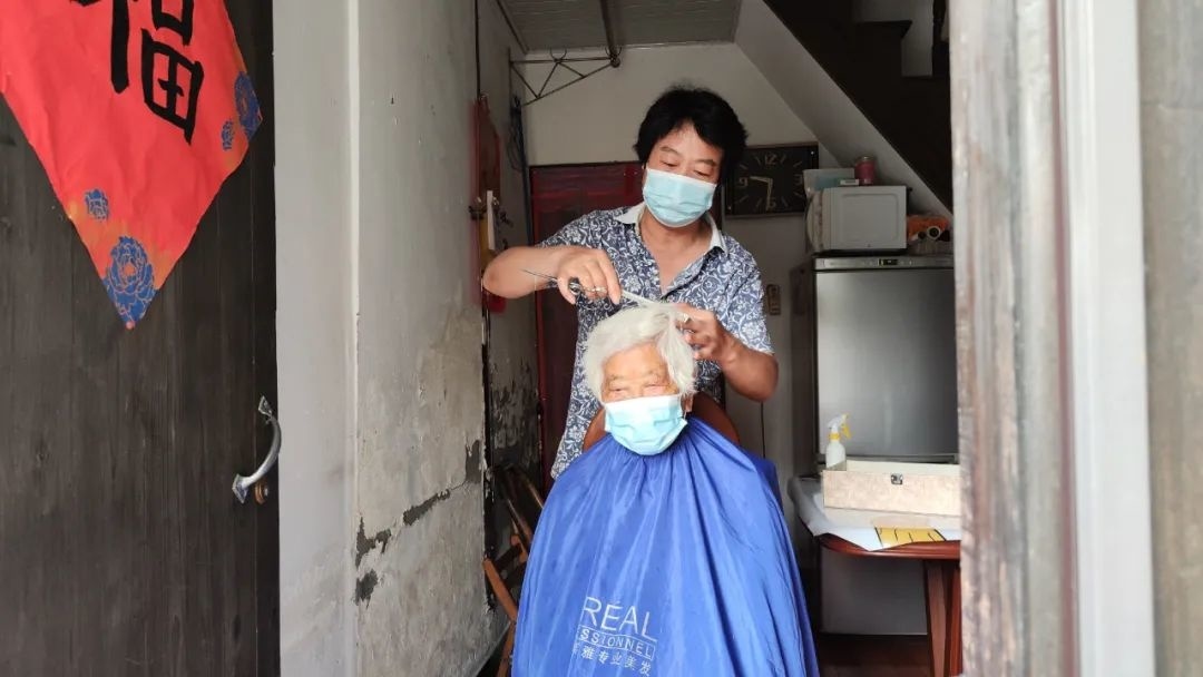 家住桥湾弄15号的张阿婆今年91岁了,近几年视力与听力不太好,很少外出,她的清爽短发就由潘师傅“承包”了。同一个居民区的高龄老人还有81岁的郁阿婆、89岁的孙老伯、94岁的周阿婆和92岁的励阿婆,他们都腿脚不便,所以理发全靠潘师傅的义务上门服务。