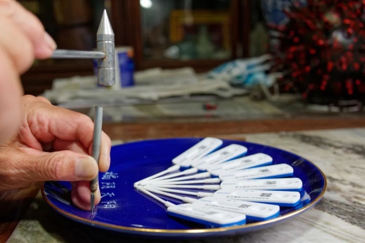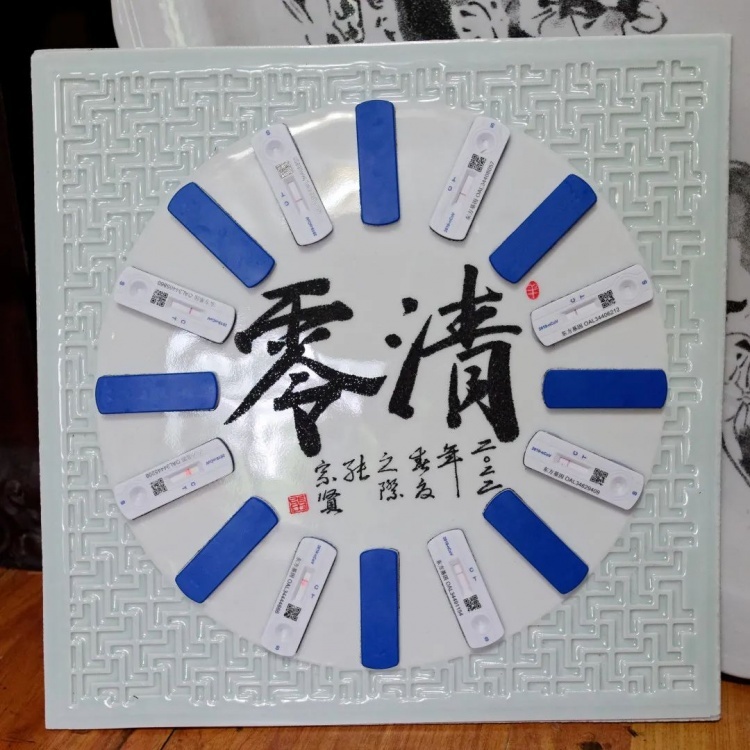 今年3月中旬,张宗贤开始居家抗疫。期间,张宗贤将自己的所思所想、所见所闻付诸于瓷刻创作之中。其中,他在一张瓷板上雕刻了“清零”两个大字,但他却感到:“力量不够”。这时,村里下发的抗原试剂,引发了他的注意。“上海人人都在使用的抗原试剂,和清零是紧密相关的。没有市民主动自觉地进行抗原自测,清零工作谈何容易!”有了创作灵感,张宗贤就将一枚枚抗原板张贴到瓷板上,如同城墙一般将“清零”团团围住。一件外观典雅、寓意鲜明的非遗创意作品就这么完成了。