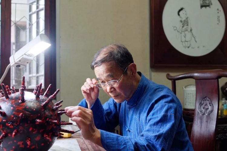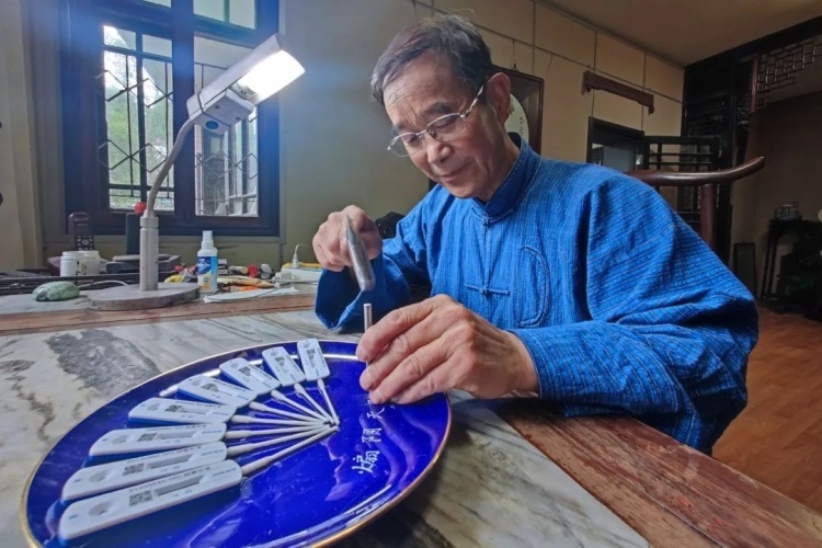 今年72岁的张宗贤,研习瓷刻艺术已有50多年。早在2020年,他就将抗击疫情与瓷刻结合起来,在瓷盘上雕刻钟南山等抗疫人物,以及“武汉加油”等抗疫书法。