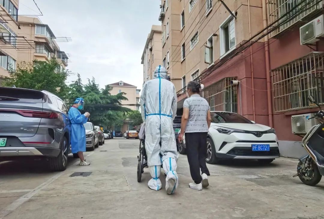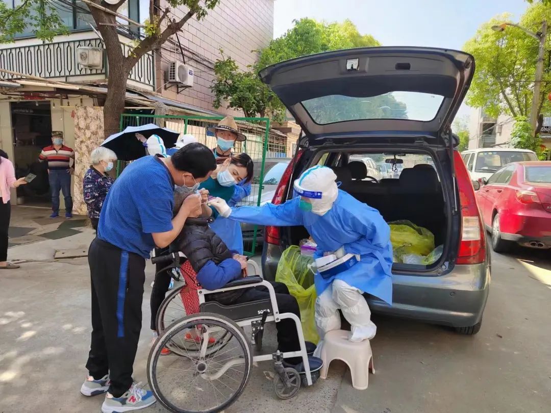 吴淞街道海滨八村第一居民区全员核酸,遇到行动不便的老人,书记用轮椅亲自推老人到点位做核酸,并在做完后将老人送回去。