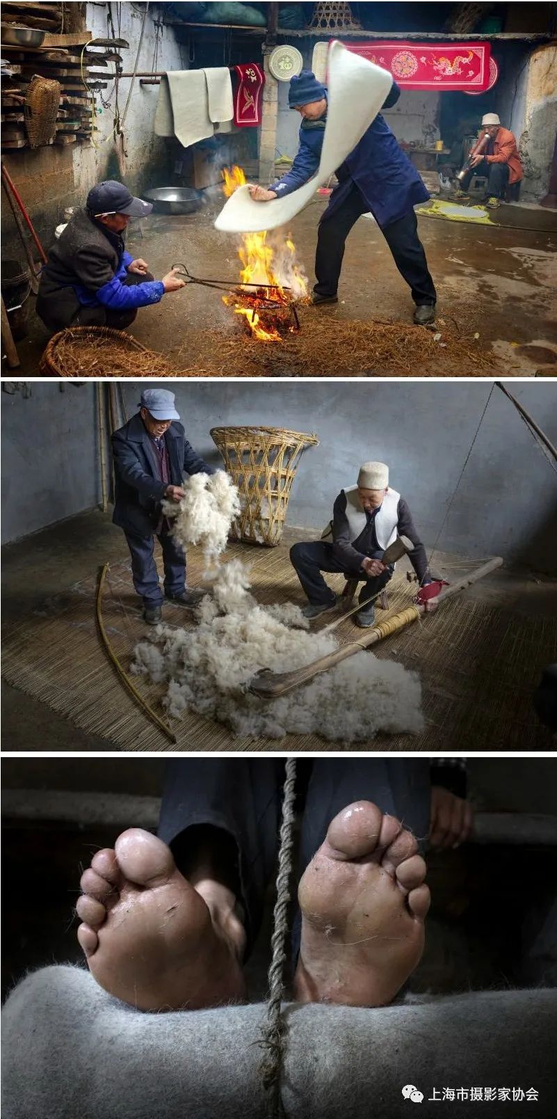 2021年摄于云南省会泽县大桥乡。赵书义,云南省会泽县大桥乡杨梅山人。今年六十三岁,是会泽县擀毡制作技艺代表性传承人。2013年被列入曲靖市非物质文化遗产保护名录。赵师傅从十五岁跟随大爹学习擀毡技艺,至今已有四十八年,其中一半的时间在走村窜寨为各地村民擀制各类家居毛毡用品。从讨生活到如今的非遗传承人,其间经历了二三百年的历程。赵师傅说,他的祖上是从南京过来的将军,到宣威后就没有走了,后来学会了这门手艺讨生活。
