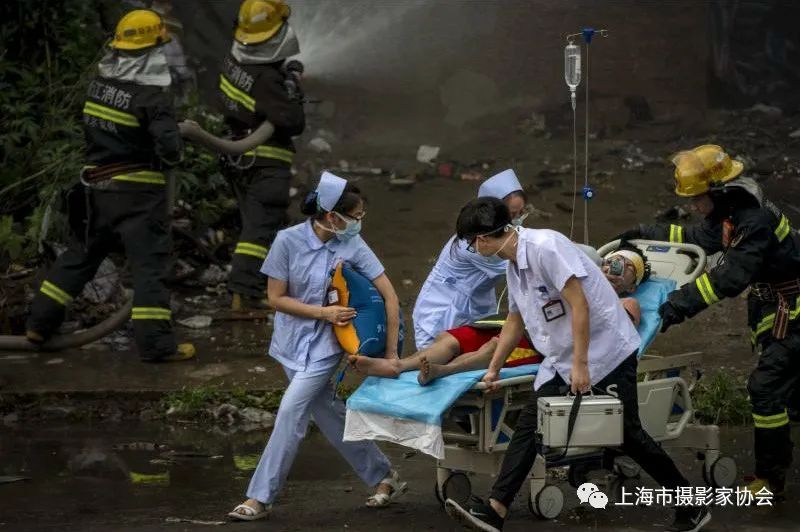 2018年7月4日,拍摄于浙江省丽水。火灾现场,医护工作者正在争分夺秒地抢救伤员。