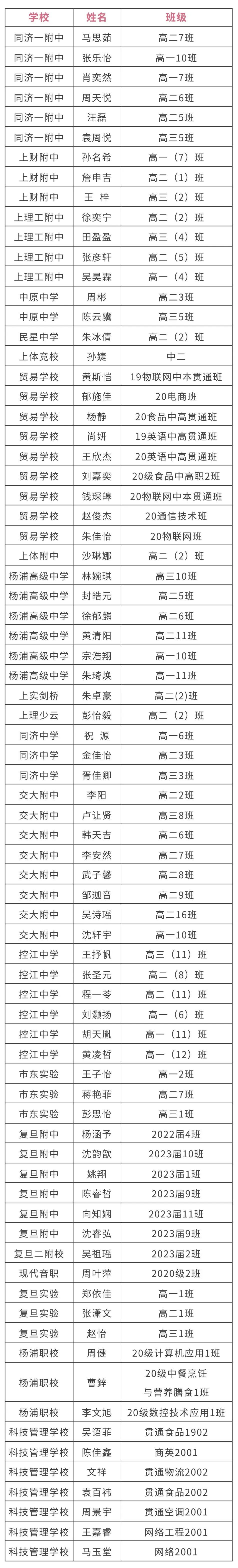 2021-2022学年上海市中等学校三好学生(6人)