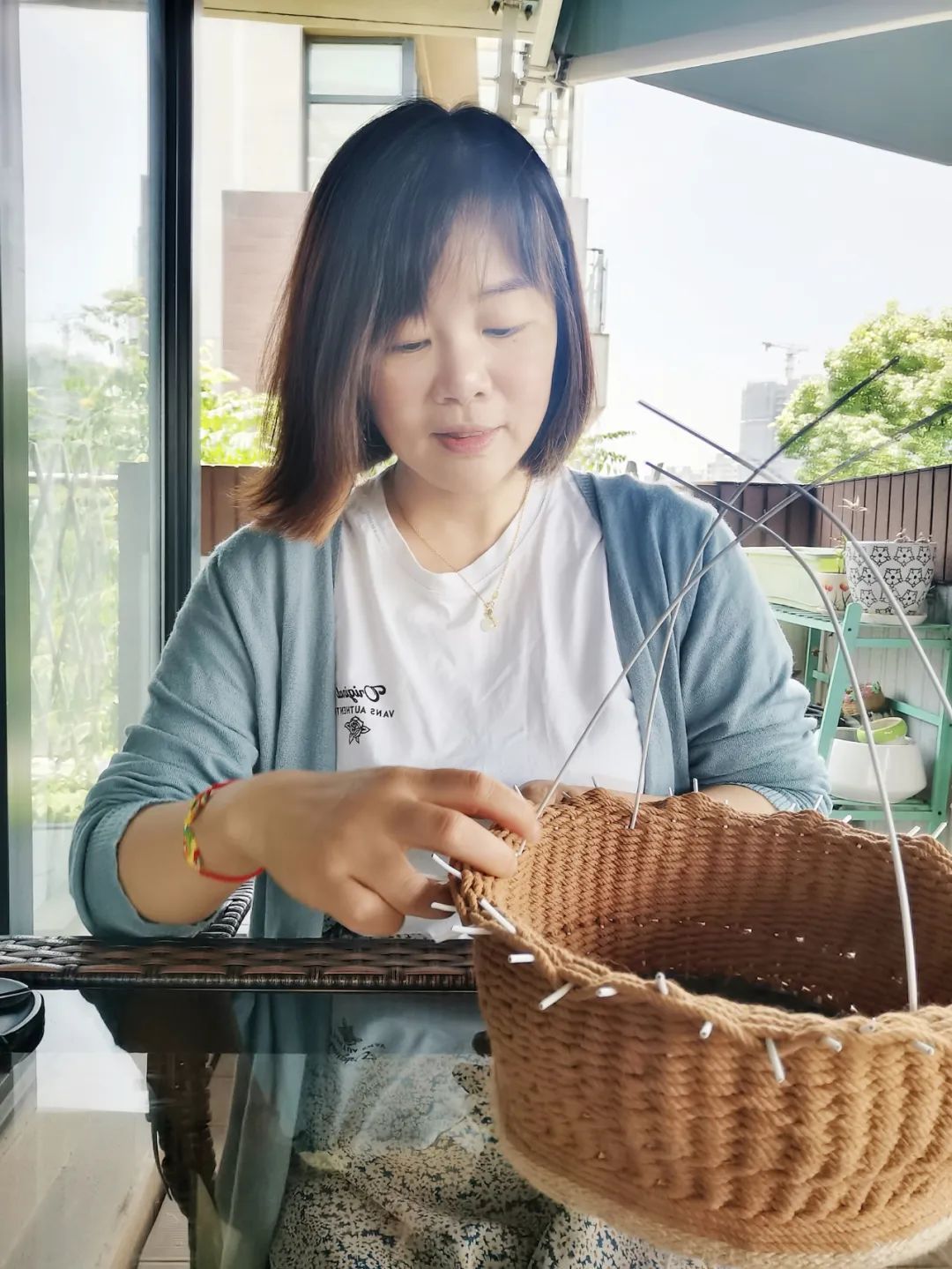 管晓晨是一名自由职业者,闲暇之余喜欢用麻绳编织各类物品。“做手工可以抛开日常生活的繁琐,是一个放松且解压的过程。”管晓晨介绍,每天下午,她会在客厅或者阳台开启“治愈时光”,一做就是三四个小时,翻转、打结、缠绕,指衔麻线,流畅地编绕着,精致美观又非常实用的收纳篮就完成了。