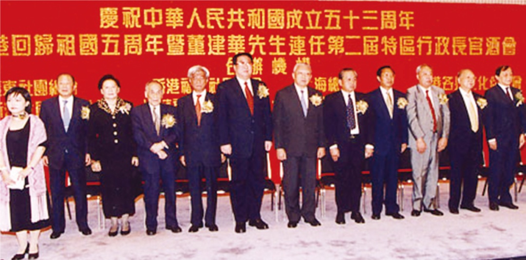 2002年,胡法光(左二)在庆祝中华人民共和国成立53周年、香港回归祖国5周年暨董建华先生连任特区首长酒会上
