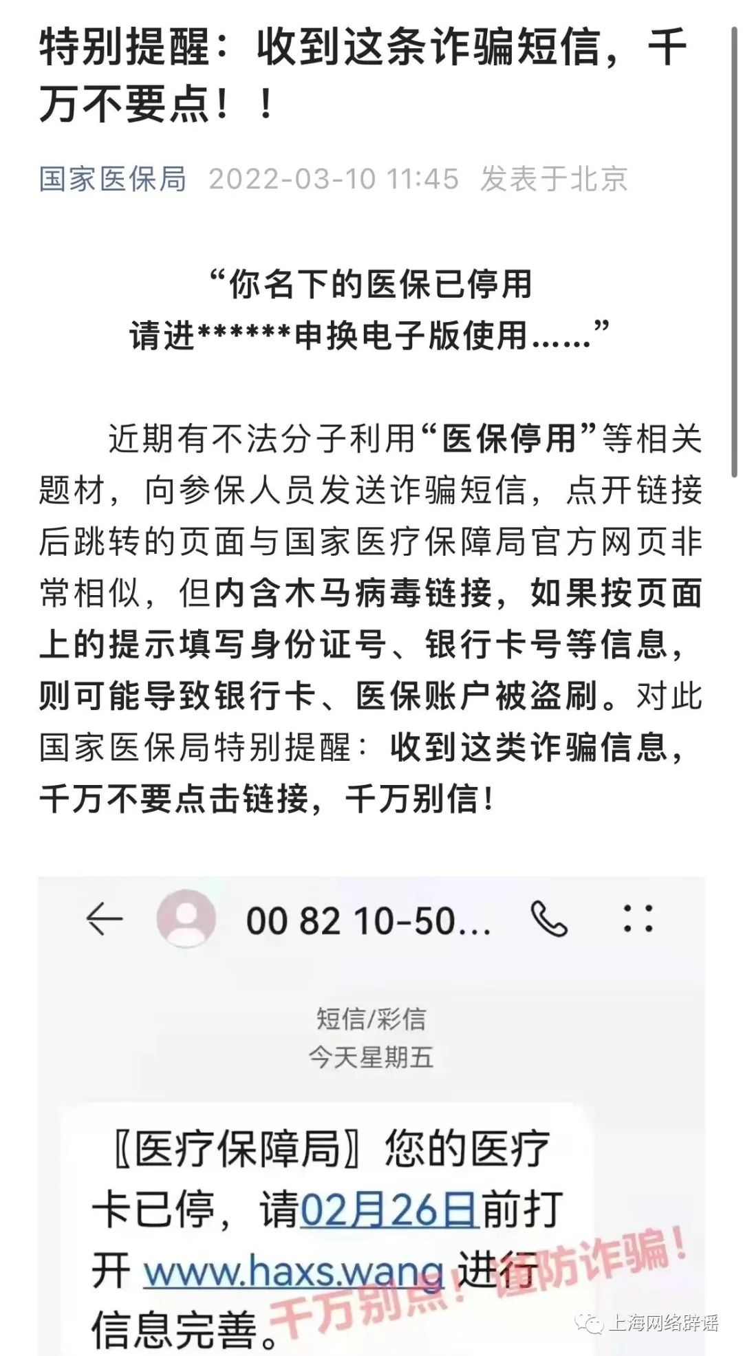上海辟谣平台核查时还发现,冒充“医保部门”发放短信的诈骗案例在外省市也曾发生过,均被辟谣。从相关短信内容看,除了声称医保账户即将停用,还有“提醒”接收者要升级医保账户或声称如果不点击链接,将不能报销的。这类短信大多会附加一个不明链接,诱骗公众填写。
