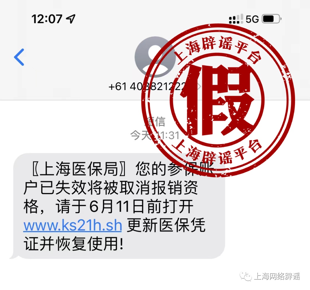 近日,有网友向上海辟谣平台反映,收到一条标注来自“上海医保局”的短信,称参保账户已失效将被取消报销资格;短信还提供了一个链接,要求点击更新医保凭证。网友希望求证真伪。