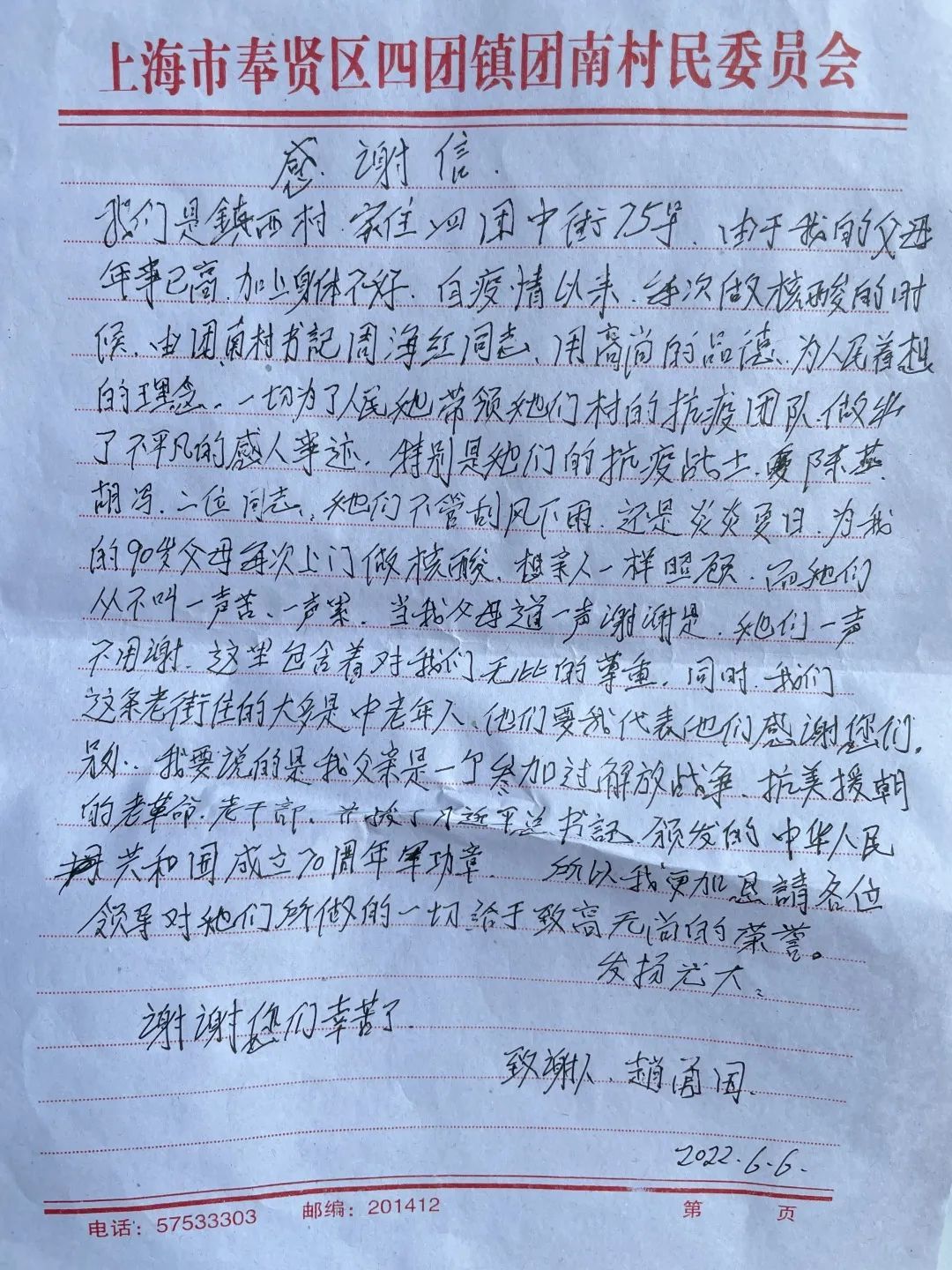 团南村村民的感谢信