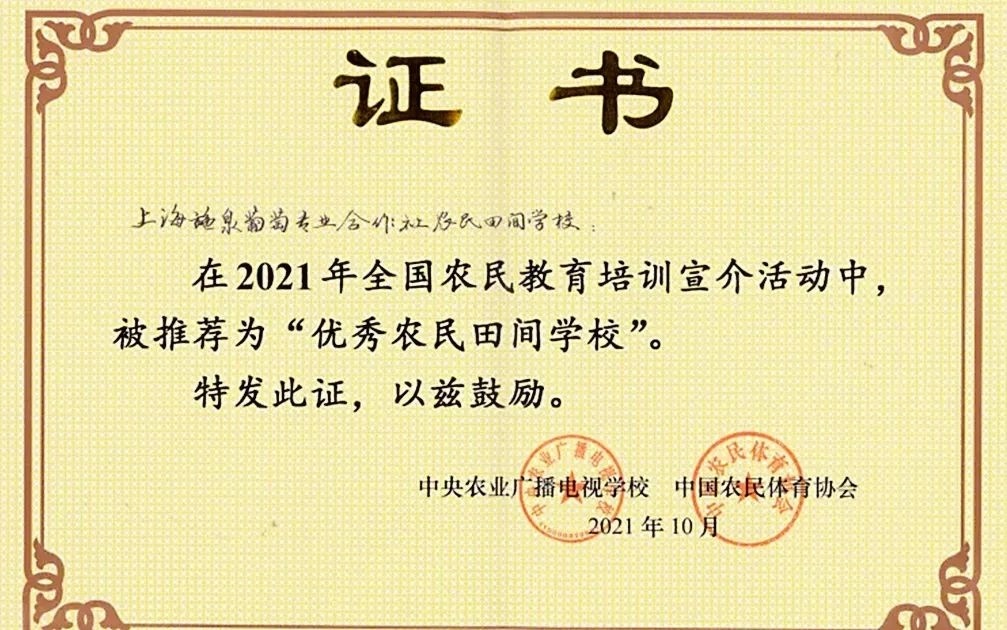 好消息!上海施泉葡萄专业合作社农民田间学校(以下简称施泉葡萄农民田间学校)获评2021年全国农民教育培训“优秀农民田间学校”,由中央农业广播电视学校、中国农民体育协会授予证书。据悉,这在金山区还是第一家。