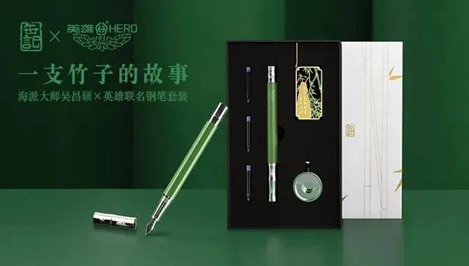 此次上线“文化云”的“缶记”艺术衍生品,大师艺术佳作被印制在一件件精巧的日用品上,包括“仙桃”“朱竹”锡盖茶叶罐、“一支竹子的故事”英雄联名钢笔套装、“风竹”月光宝盒等。其中,钢笔与月光宝盒上的“风竹”图案,巧妙运用了吴昌硕晚年重要作品《风竹图》中的竹元素。吴昌硕爱竹,其家乡湖州安吉以竹著称,他一生画过许多竹子。《风竹图》中的墨竹苍劲有力,寥寥数笔却生机勃现。以此作品设计的“一支竹子的故事”英雄联名钢笔套装大气雅致,曾于2021年参展嘉兴文化产业博览会以及品质生活直播周。