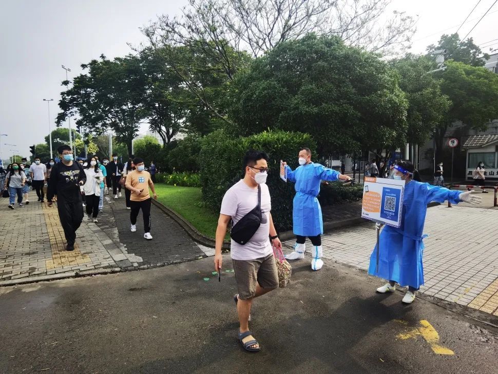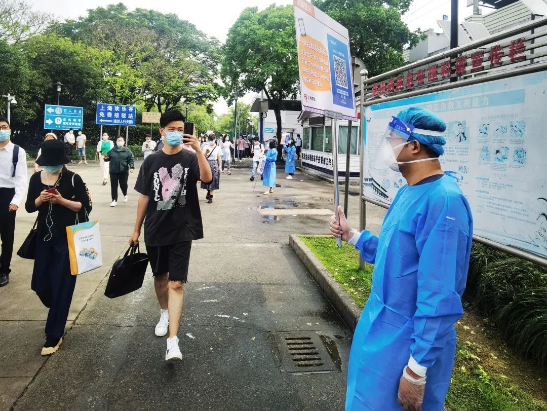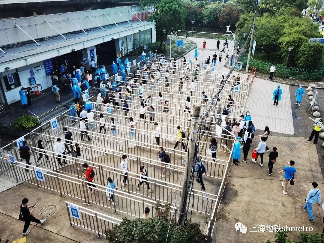 6月14日早7:25佘山站根据站外实时客流情况启动限流措施,将1号口站外隔离栏杆同时开放4个进站通道,乘客们在现场工作人员及志愿者们的引导下快速、有序进入蛇形通道,完成“场所码”的扫码、验码工作后顺利进入车站。